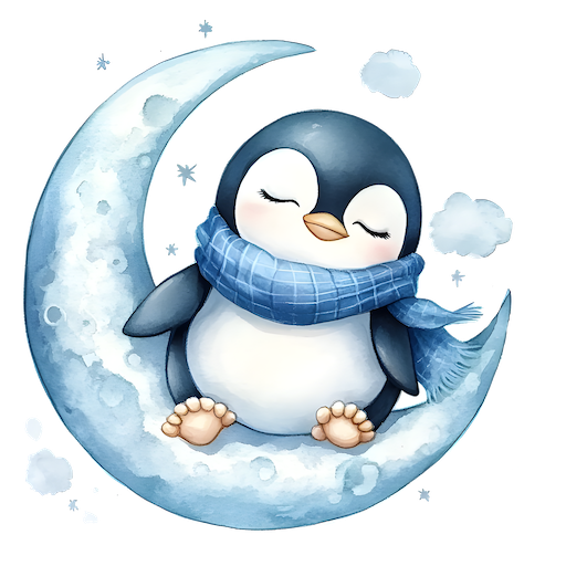 Χαριτωμένα αυτοκόλλητα με θέμα νυσταγμένους πιγκουίνους. Αυτό το σχέδιο δείχνει έναν γλυκό πιγκουίνο με κλειστά μάτια, φορώντας μπλε σκούφο και κασκόλ, να χουζουρεύει πάνω σε ένα απαλό συννεφάκι χιονιού. Ιδανικό για όσους αγαπούν τις ήρεμες, χαλαρωτικές στιγμές